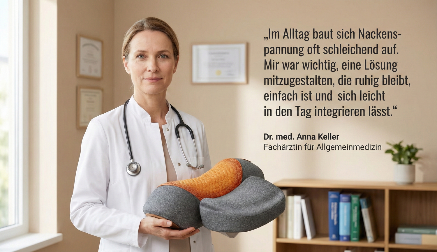 NeckSolus ist nicht als Therapie entstanden. Sondern aus der Frage, wie sich tägliche Nackenspannung ohne Aufwand reduzieren lässt. Deshalb wurde das Produkt gemeinsam mit medizinischer Perspektive entwickelt – ruhig, zurückhaltend, realistisch. Kein Versprechen. Keine Überforderung. Ein Ansatz, der sich in den Alltag einfügt,